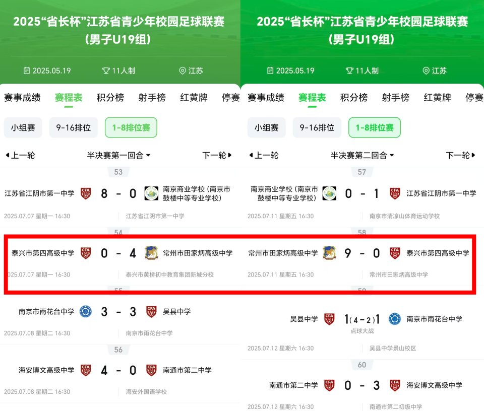 而省长杯U19组别,泰州四高出战分在A组,以3胜1平拿到小组第二出线。排位赛首轮,以两个0比5惨败海安博文高级中学。排位赛第二轮,分别以0比4,0比9惨败常州的田家炳高中。