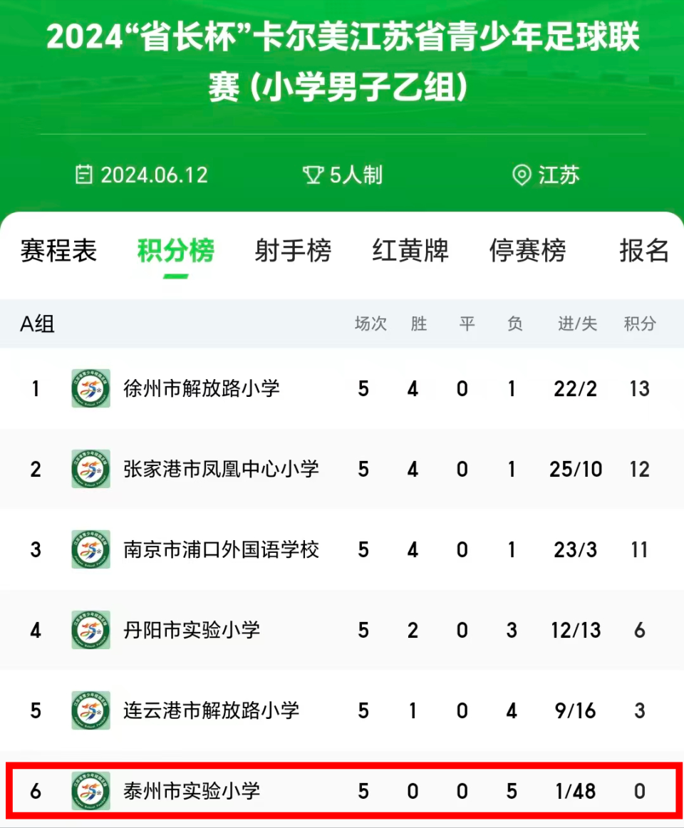 而在校园足球体系,今年省长杯男子组初中组、小学甲组、小学乙组没有一个泰州的学校参加。去年泰州市实验小学倒是参赛了,结果呢?小组赛期间5场比赛,进1球狂丢48球。
