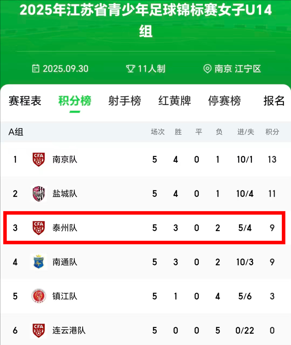 泰州U14女足,跟南京、盐城、泰州、南通、镇江、连云港一组,小组赛期间3胜2负排在小组第三!排位赛首轮点球大战击败常州,排位赛第二轮点球大战输给徐州,排在所有参赛球队的第6位!