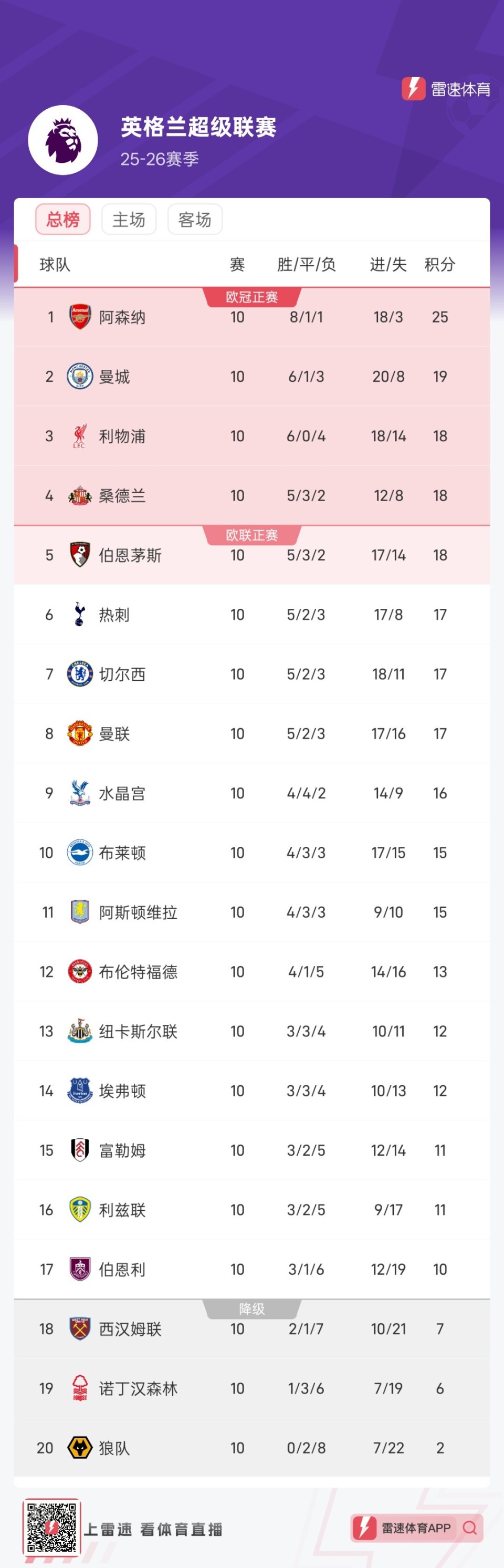 英超前10轮积分榜:阿森纳25分居首,曼城、利物浦紧随