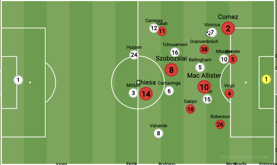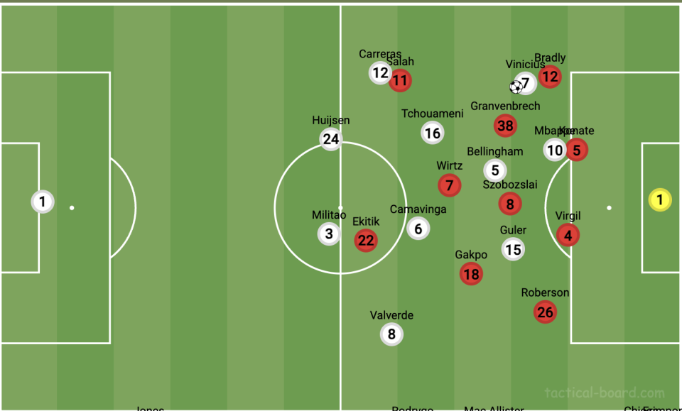 但是卡瓦哈尔受伤反而有个好处就是,巴尔韦德成为右后卫的首选,这几乎和利物浦对同样全能的索博斯洛伊的用法极其类似,也是命中注定了。巴尔韦德其实是个非常全面的球员,他首发右后卫能提供比卡瓦哈尔更多的进攻选择的同时,防守还不太落下风:比方说,他既能够下底套边传中,也能在防守一区和进攻二区发动斜向角度往左路强侧的转移,他的组织和出球精度也比较高,传球渗透性较为强,硬要说缺点的话,就是因为这是他后期加点出来的技能点,传的长距离传球以直球为主,缺乏内旋的转速,导致有时候容易传大,队友不好停和不好接。但是这可边可中的进攻手段其实是一个大杀器,关键看看阿隆索会怎么运用。主教练阿隆索其实是一个「兵无常势,水无长形」的风格,这点他和其过去的老师安切洛蒂一样,不拘于一种战术风格和一种常规阵型。在入主皇马之后打过433,4141,4231,3421多个不同的阵型。考虑到皇马较为擅长的打法,我个人预测的皇马首发有可能是和对阵巴塞罗那的比赛类似:是一种类4231的起手阵,首发琼阿梅尼和卡马文加最大的要点,其实就是遏制住利物浦主打右路的进攻,让琼阿梅尼和卡雷拉斯协防萨拉赫和索博斯洛伊的配合。在中场进攻二区大幅搅乱利物浦的进攻组织和出球,特别是利物浦在这个赛季,在右路丢失球权特别多,特别容易被直上直下地打法所克制:这种堆绞肉机换空间和节奏的玩法,在过去英超利物浦连败的几场里被各大球队纷纷利用,水晶宫是最早这么玩的,针对转换其实利物浦在右路的防守特别薄弱——特别是在格拉芬贝赫被抽调上去支援法老之后。除此之外,利物浦这赛季还丢掉了关键的高位转换能力,前场压迫体系发挥的最好的,只有刚刚过去对阵维拉的比赛,但是也拼得索博和萨拉赫体能枯竭,这场比赛能不能继续保持这样的反抢和高位效率,利物浦是存疑的。所以进攻阶段,皇马由于在客场,阿隆索很大概率会用这样的安排:中场抢下球之后,回做给赫伊森拉开传球角度之后,由赫伊森迅速打利物浦最痛的右侧进行反击,前场的跑位当中,维尼修斯可以自己持球和姆巴佩交叉换位在禁区弧顶射门,也可以姆巴佩跑后点,贝林跑前点,居莱尔跑中路大弧顶打倒三角传中:其实现在范戴克下滑很多,由于速度下降,很多关键的预判和防守行为会受限于这具衰老的身体而出现失误——此前的送点就是身体跟不上脑子的典型。只要姆巴佩会跑后点,那么不管利物浦首发是罗伯逊还是科尔克兹,在面对姆巴佩在后点绕盲区包抄都会比较吃力。这种高节奏转换对于利物浦来说是非常难受的,赫伊森本身的传球水平相当高,左路的后场Build Up的关键人还是得看赫伊森。另外在这种情况下,如果后场赫伊森Build Up遇到利物浦的压迫出不了球的情况下,那么皇马还有另外一个可以发起进攻的点,巴尔韦德和居莱尔连线,由于加克波的大身体模型,反抢当中只要一个防守到位率没跟上,巴尔韦德这一侧就有可能直接找到居莱尔、姆巴佩、维尼修斯的防守一区到进攻三区的推进。但是由于居莱尔增肌导致降速,最终球还是会往左路发展,右路的巴尔韦德插上更多是拉开利物浦防线宽度,给中路制造机会的策应性跑动,来打进攻三区的阵地战。所以皇马客场进攻的关键点在于转换的效率,这也是从穆里尼奥时代开始就刻在皇马基因里的东西。对于利物浦来说,情况就稍微复杂一点,按照首发来排的话,很大概率是这样:继续延续上一场对阵维拉胜利的首发,但是这里有个很大的问题在于,比赛之间的间歇短,恢复期少,面临到的很可能是能不能维持高强度比赛节奏的体能问题。我们从上一场对阵维拉的比赛80分钟以后已经看到法老和索博有力竭的情况出现,斯洛特肯定是知道赫伊森这个进攻发动机的问题,也会对赫伊森具体地压迫和布置,但是是否能执行到位,关键还是看萨拉赫和索博斯洛伊的体能和战术执行力。当然,索博是没有问题,但是利物浦两边的跑动量确实是存在着较大的问题,加克波的大身板和体重,导致运动能力不高,防守到位率低,一旦比赛强度过高,体能分配就会成为问题,失误也会随之增多。利物浦本赛季抛开联赛杯和社区盾杯,在75分钟后的丢球已经来到了7个,占所有丢球的一半,这种很多都是下半场体能不够导致精神不集中的具体表现。所以斯洛特很大概率会先选择抢开局的形式拿下一两个进球,然后再进行换人来保持压迫强度,利物浦的进攻其实变化并不多,不上维尔茨的情况下,其实利物浦能创造出来的进攻机会是有限的,但是上了维尔茨,利物浦的防守就会出现问题。所以这场比赛,为了有足够的后手,斯洛特有可能先发维尔茨,针对皇马的问题来先打一个,皇马的问题很简单,但是并非处理不了,这个问题在于防空。赫伊森本身的防空能力,在190cm+中卫里其实不算特别出色,主要是缺乏对长距离冲顶的预判不足,而皇马另外一名中卫米利唐由于身高,防空能力更差。所以利物浦在进攻手段缺乏的情况下,很大概率会通过萨拉赫在45°角斜传中的方式,让加克波和埃基蒂克去顶作为自己的有效进攻手段——毕竟加克波也是190cm+,头球不错的一个非传统逆足边锋。能不能打破僵局,关键在于法老到底是延续维拉那场的表现复苏,还是继续像过去几个月一样萎靡,因为如果法老拿不住球,丢失球权的情况下,利物浦的反抢和防守其实是个问题。斯洛特也很大