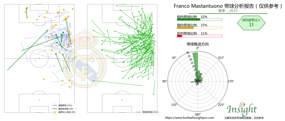 今晚是欧战小组赛利物浦主场对阵皇马的比赛,由于有读者朋友感兴趣,我就写个提前前瞻,大概聊聊双方比赛一些核心的点。(今天有两篇内容,第二篇是朋友写的桑德兰战术分析,感兴趣可以移步前往)对于皇马来说,赛前的消息大多都是不利的,马斯坦多诺伤了,卡瓦哈尔又双叒叕大修,吕迪格还没康复,特伦特紧急复出,目前情况来说,皇马遇到的大部分问题,其实和此前的一个赛季类似——防线伤病。但是比安切洛蒂那会儿背得实在没办法的要好一点的是,起码米利唐和赫伊森是能掏得出来成为首发的,替补席还坐着一个阿森西奥。而马斯坦多诺在右路能给到的比赛贡献,其实十分有限,他的缺阵与否对于阿隆索来说其实并不关键。这里稍微聊一下马斯坦多诺,这个孩子和大部分标签为「阿根廷人」的球员差不多,在底盘的精细处理球能力方面确实有过人之处,而且也很敢拼敢抢,具有战斗精神,这些都是优点。作为皇马的主力首发逆足右边锋,一对一和狭小空间处理球可以依靠他的战斗精神对抗,以及细致地处理球能力在右侧肋部效果比较好,但是马斯坦多诺的冲刺速度其实相对较为有限,如果给他安排在弱侧大空间,他的持球推进能力和冲刺速度有部分情况会导致被回追卡住空间和位置,而弱侧天然少队友支援,球也很难以传出来,只能被迫单干,或者横向带球到中路打配合,最后导致反击降速:事实上,皇马大部分的右边锋其实都有「无法成为弱侧」的问题,马斯坦多诺如此,居莱尔、罗德里戈等放在右路也如此。而马斯坦多诺其实和居莱尔的模型是有点像的,二人比起爆点硬突的边锋,更适合作为一个肋部前腰来使用,特别在居莱尔增重了之后,原本10-11的摇摆位,现在有了对抗固定在10号位,马斯坦多诺本来对抗就超越了他这个年龄很多,要是练练传射,也有可能能作为10号位。所以皇马到目前为止,右路的进攻问题其实还是没有得到解决:相较于马斯坦多诺的受伤,皇马其实受到的影响并不算太大,右路该是瘸子还是瘸子,其实新赛季卡瓦哈尔由于年龄和伤病隐患,已经极少插到对方底线来拉开进攻宽度了,右边的进攻天然缺乏进攻宽度,只能走内线是目前皇马的最大问题。