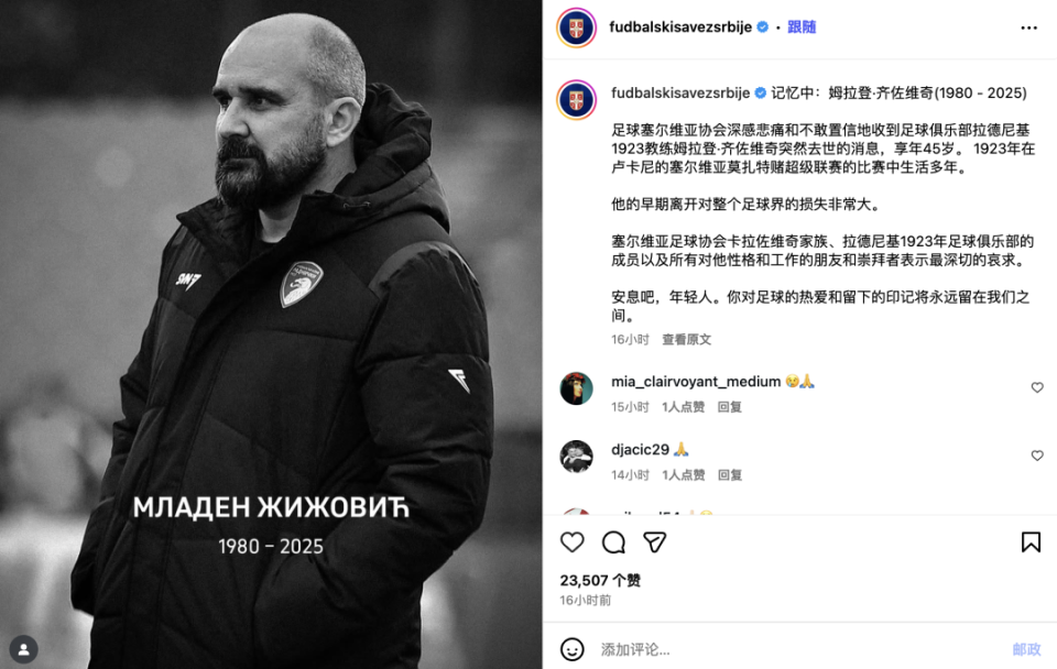 塞尔维亚足协写道:“我们怀着深感悲痛和不敢置信的心情收到一则噩耗,足球俱乐部劳动1923教练姆拉登·齐佐维奇突然去世,年仅45岁。