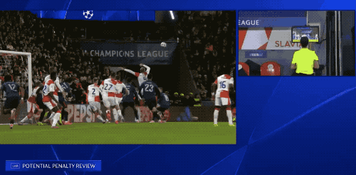 第30分钟,索博斯洛伊起脚射门,皮球先是打在琼阿梅尼的膝盖上,反弹到了手臂上,VAR介入,裁判确定没有点球。