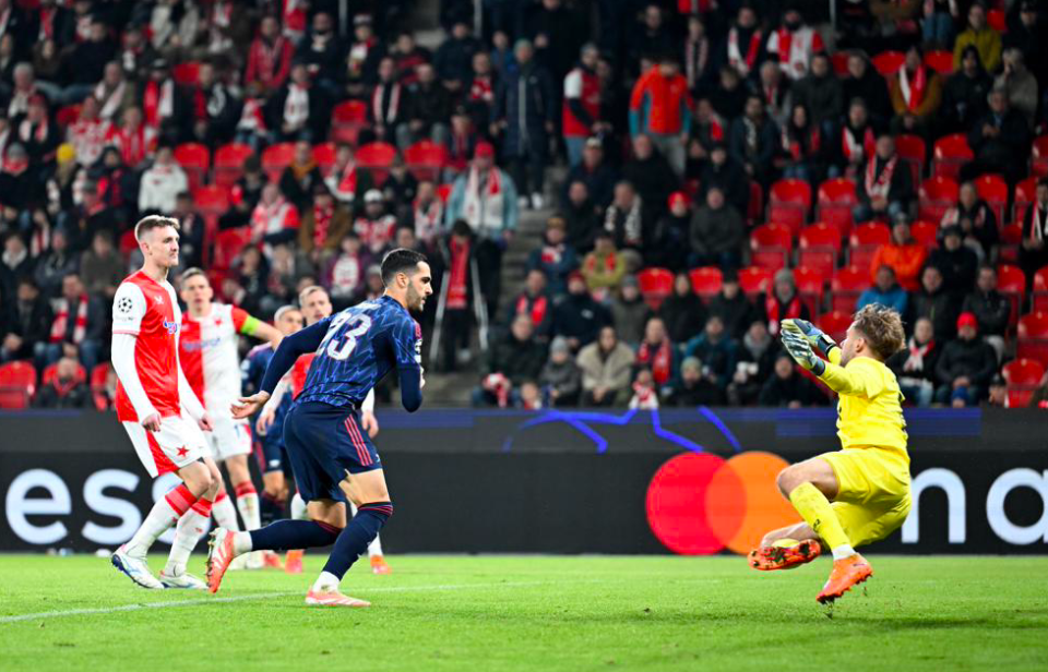 萨卡亲自操刀,皮球钻入死角,这是萨卡连续4个欧冠客场破门,创造枪手纪录。
