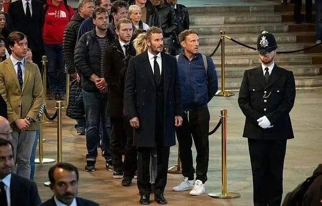 而女王刚去世那会,小贝和普通人一起在灵柩前排队13小时,默默擦眼泪瞻仰灵柩。