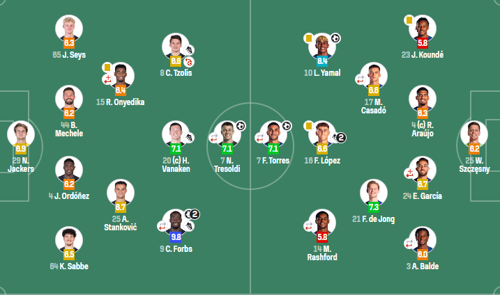 巴塞罗那(4-2-3-1):什琴斯尼;孔德,阿劳霍,埃里克-加西亚,巴尔德;卡萨多(58'奥尔莫),德容;亚马尔,费尔明,拉什福德(83'巴德吉);费兰-托雷斯(58'莱万多夫斯基)