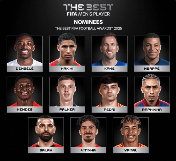 值得注意的是,这11人跻身了今年金球奖的前3名,只有第9位的意大利门神多纳鲁马和第11位的克瓦拉茨赫利亚,没有入选这份候选名单。不出意外,金球奖得主登贝莱,还有第2名亚马尔,依然会是今年世界足球先生的两大热门得主。