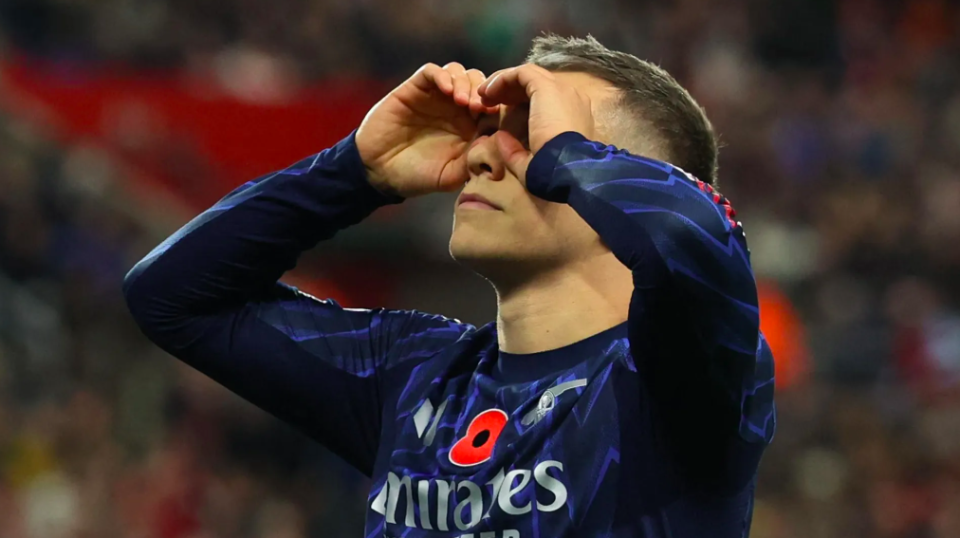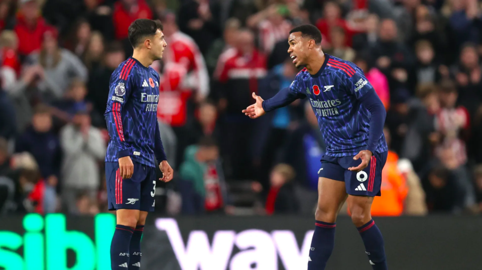 阿森纳首发:1-拉亚、2-萨利巴、6-加布里埃尔、12-廷伯、33-卡拉菲奥里、10-埃泽、23-梅里诺、36-苏维门迪、41-赖斯、7-萨卡、19-特罗萨德。