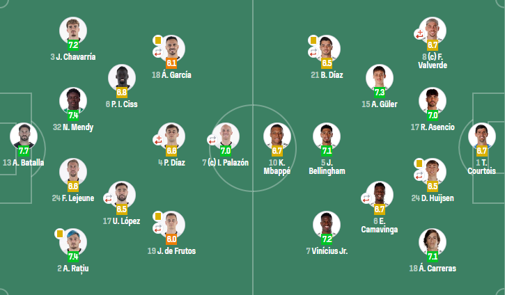 皇家马德里(4-2-3-1):库尔图瓦;巴尔韦德(83'阿诺德),劳尔-阿森西奥,赫伊森(46'米利唐),卡雷拉斯;居莱尔,卡马文加(79'罗德里戈);布拉欣-迪亚斯(71'塞瓦略斯),贝林厄姆,维尼修斯;姆巴佩