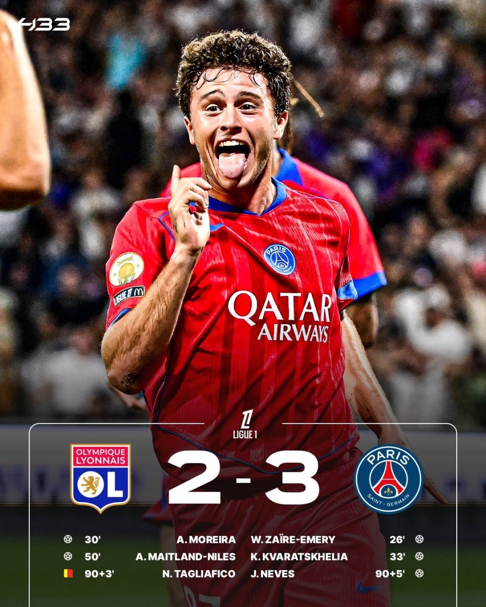 法甲第12轮,巴黎圣日耳曼客场3-2绝杀里昂。埃梅里、克瓦拉茨赫利亚破门,维蒂尼亚两次助攻,莫雷拉、奈尔斯帮助里昂两次扳平,塔利亚菲科两黄被罚下,内维斯补时绝杀。