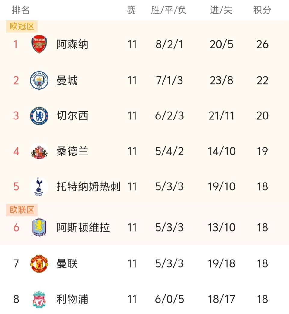 北京时间11月10日,英超联赛第11轮战罢,曼城主场3-0完胜利物浦,此役过后,曼城7胜1平3负积22分,排名第2,本轮战平的阿森纳以4分的优势领跑,利物浦近6场英超比赛已经输了5场,他们下滑的速度有点快,已经被曼联超越,排名联赛第8!