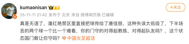 赛后知名媒体人“kumaonisan”就狠批潘红艳:“真是无语了,这种失误太低级了,下半场丢的两个球一个比一个难看,你的门守的对得起教练,对得起队友吗?,这个状态国门敢让你守吗?”