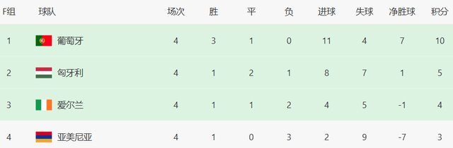 葡萄牙10分,匈牙利5分,对C罗领衔的葡萄牙来说,11月13日客场挑战爱尔兰,赢球就能提前晋级2026年世界杯。