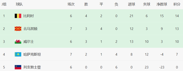 比利时6场14分,北马其顿7场13分。15日的世预赛,比利时只要战胜哈萨克斯坦,就能提前出线。