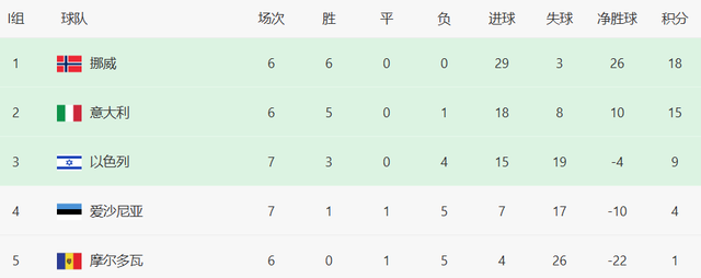 挪威18分领跑,意大利15分紧随其后。13日,挪威vs爱沙尼亚,意大利客战摩尔多瓦;16日,意大利和挪威直接交锋。挪威占据主动权,意大利只能祈祷奇迹发生。