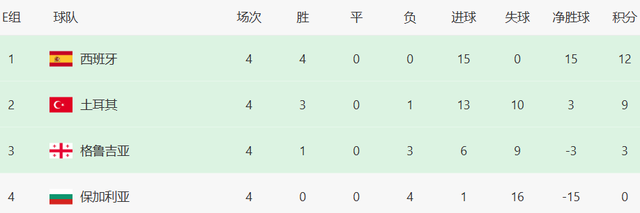 西班牙12分,土耳其9分。11月15日,西班牙客战格鲁吉亚,土耳其vs保加利亚,如果西班牙赢球,土耳其不胜,斗牛军团将提前出线。