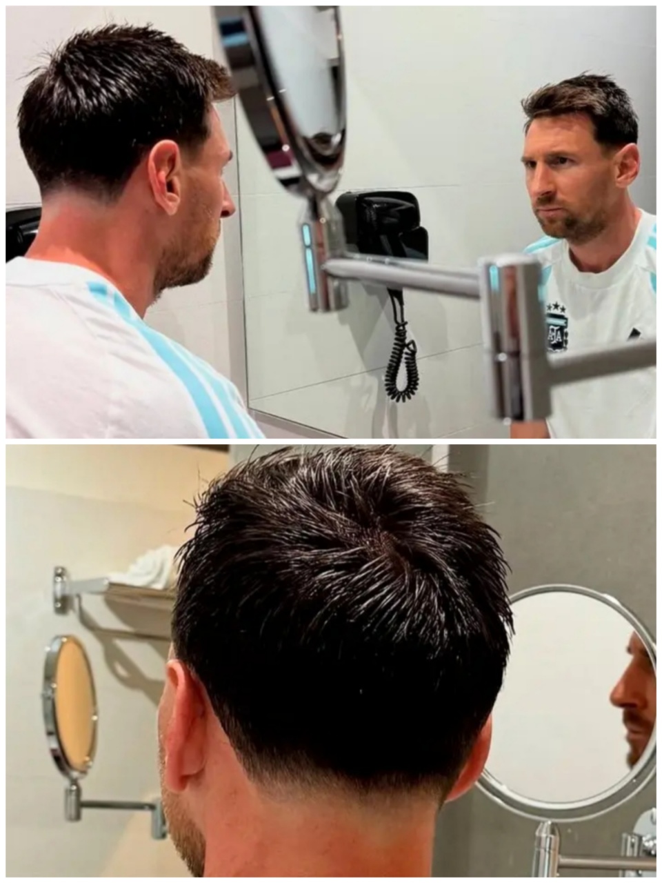 目前梅西在西班牙跟随阿根廷国家队集训,备战阿根廷周末对阵安哥拉的友谊赛。在夜访了巴萨主场诺坎普球场之后,梅西的心情大好,所以今日梅西特意给自己换了一个新发型。可以看到梅西对着镜子看着自己的新发型,眼神坚定的样子,看起来对于自己发型很是满意。可以看到梅西剪短了自己的头发,四周推干净了,很是干练的样子。从照片上看,梅西的胡子并没有完全刮掉,不知道之后会不会刮掉,可能要等到对阵安哥拉比赛的时候,我们才能知道梅西有没有把胡子刮掉。