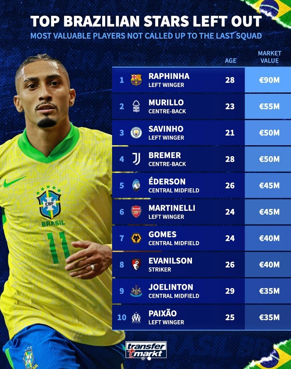 北京时间11月13日,德转统计出此次没有入选巴西国家队身价排名前10的球员,巴塞罗那的前锋拉菲尼亚9000万欧元高居第一,萨维尼奥、布雷默以及马丁内利也都上榜。