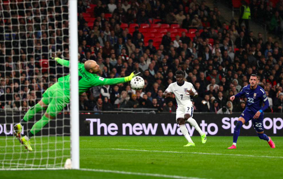 第25分钟,英格兰获得前场任意球,拉伊科维奇双拳出击,但皮球并没有被打远,奥莱利的射门被挡了一下,萨卡不停球直接射门,皮球应声入网。