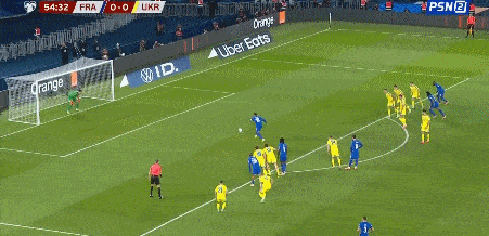 本场比赛,法国队只要取胜就可以提前出线。上半场,法国队未能破门,0-0。下半场,乌克兰后防线送礼。第53分钟,奥利塞在对方禁区被踩到脚踝,裁判给了点球。姆巴佩主罚,打进漂亮的勺子点球。法国队1-0领先。