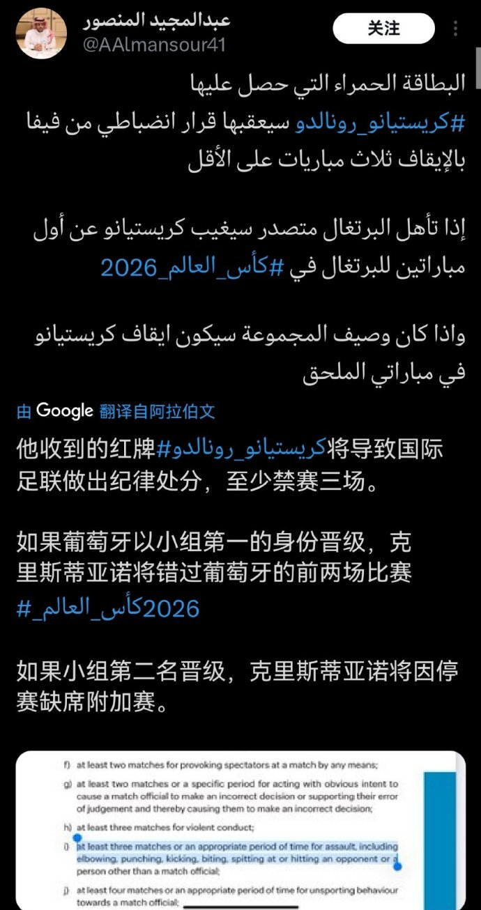 更让C罗打击的是,沙特体育律师曼苏尔透露,C罗因肘击对手吃到红牌被罚下场,属于暴力行为,按照规则,国际足联将对其处以至少三场禁赛的处罚。