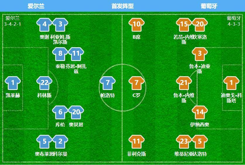 爱尔兰vs葡萄牙,哈德格里姆松排出3421阵型,首发身价1.4亿欧元,首发平均年龄26.9岁;葡萄牙方面,马丁内斯排出433阵型,40岁C罗依然首发突前,两侧是菲利克斯和B席,维蒂尼亚、鲁本-内维斯、若昂-内维斯组成三中场,达洛特、伊纳西奥、鲁本-迪亚斯、坎塞洛组成四后卫,科斯塔守门,首发身价4.6亿欧元,首发平均年龄27.8岁。