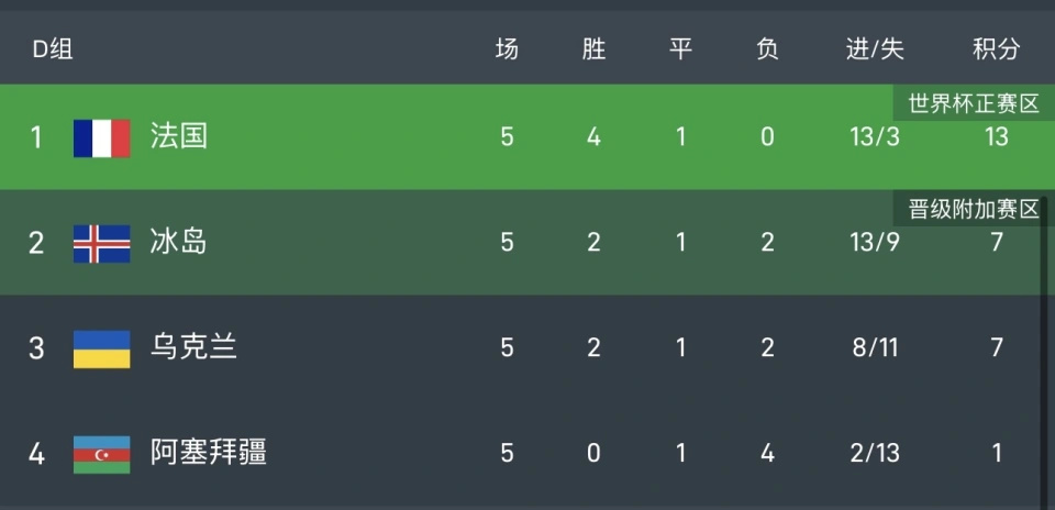 法国提前一轮锁定小组第一,直通世界杯,冰岛和乌克兰都是7分,前者多7个净胜球,最后一轮直接较量,冰岛客场打平就出线。阿塞拜疆1分出局。