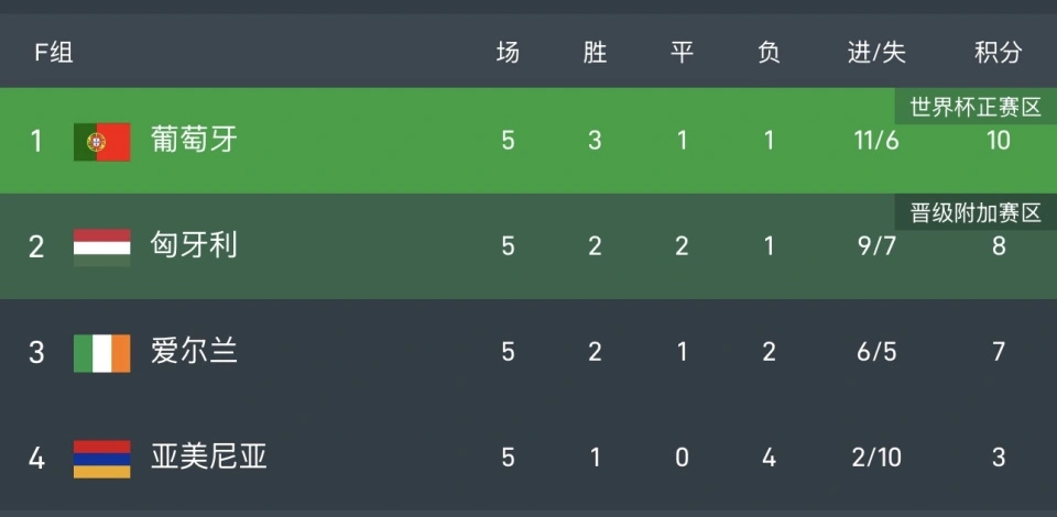 葡萄牙未能提前出线,领先第二名匈牙利2分。爱尔兰7分,亚美尼亚3分出局。最后一轮葡萄牙对阵亚美尼亚,赢球肯定出线,打平的话则有可能要比较净胜球。匈牙利对阵爱尔兰,赢球有望和葡萄牙争小组第一,至少保住附加赛资格。