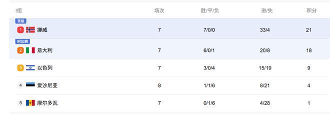 I组:挪威积21分,意大利积18分,双方最后一场交手,挪威净胜球领先意大利17个,所以意大利必须最后一场赢挪威9球以上,才能反超挪威成为小组第1直接晋级世界杯。
