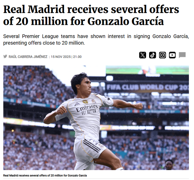 作为英超升班马的桑德兰,今年夏天就密切关注贡萨洛-加西亚,希望引进21岁的西班牙中锋,不过并未成功。凭借在世俱杯6场4球的惊艳发挥,贡萨洛-加西亚得到皇马的续约合同,续约至2030年,违约金10亿欧元。