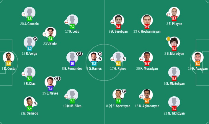上半场,韦加头槌破僵,斯佩尔扬一度为亚美尼亚扳平,但此后贡萨洛-拉莫斯小角度破门,若昂-内维斯梅开二度+精彩任意球世界波,B费点射破门。下半场,B费再进2球完成帽子戏法,内维斯再进1球也完成帽子戏法,孔塞桑锦上添花。