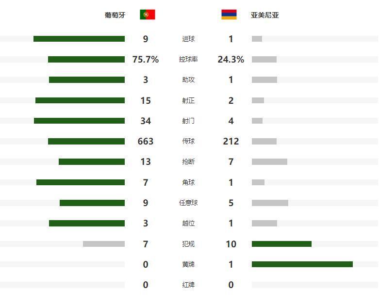 第70分钟替补登场的博尔赫斯,突入亚美尼亚禁区后被放倒,主裁判果断吹罚点球,B费再次主罚命中,将全场改写为了7-1,第81分钟若昂内维斯利用角球机会也成功戴帽,比分来到了残暴的8-1,伤停补时阶段孔塞桑再入一球,将比分定格为了9-1,帮助葡萄牙在本届世预赛的收官战,取得一场酣畅淋漓的大胜。