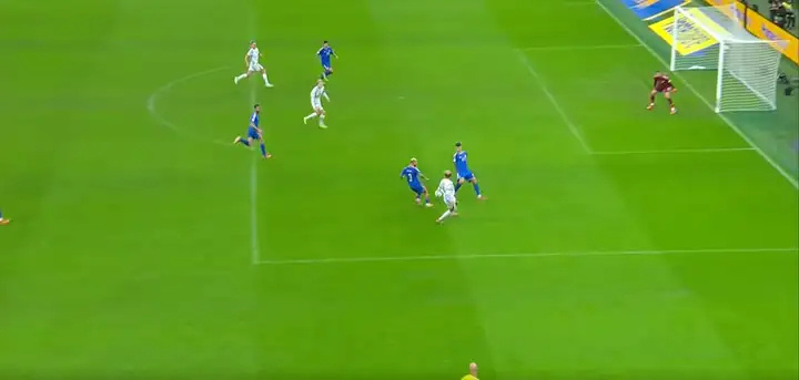 上图这个镜头,可以代表意大利队正常的颓势。面对索尔洛特、努萨还有哈兰德的冲击,意大利的球员对抗很吃亏,经常是被对手撞得东倒西歪,身体硬度、速度频率完全不在一个档次。