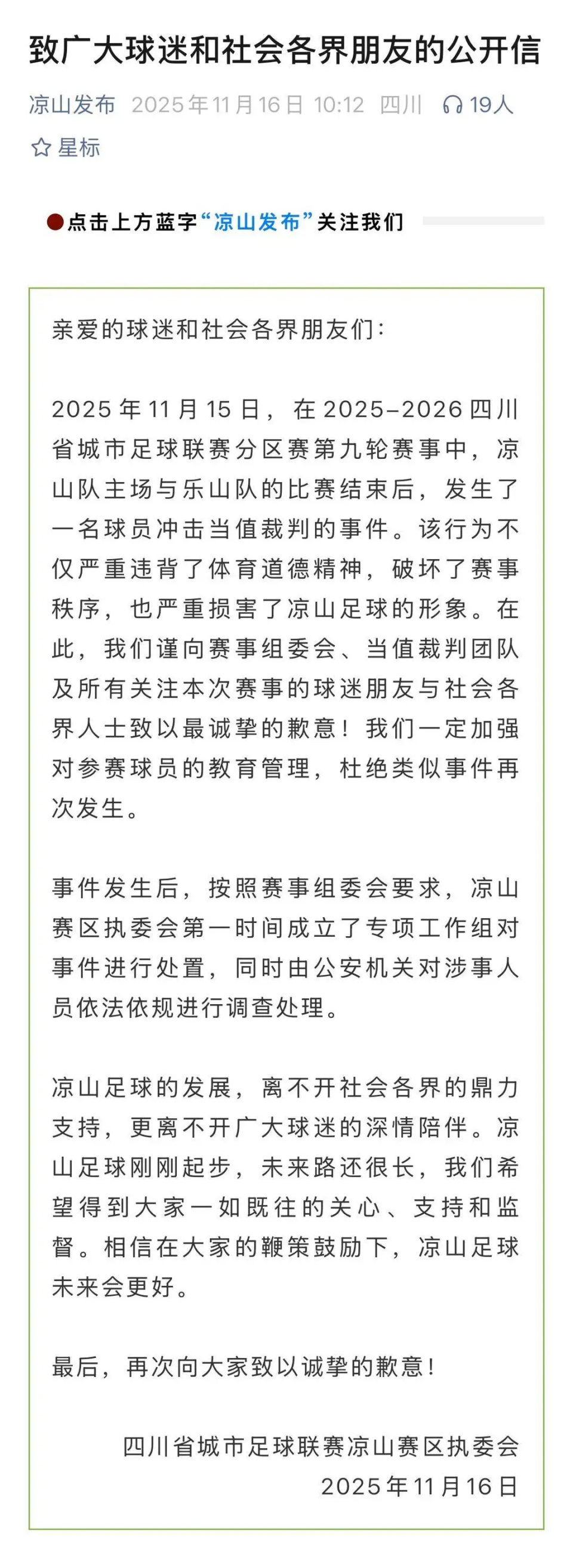 2025年11月15日,在2025-2026四川省城市足球联赛分区赛第九轮赛事中,凉山队主场与乐山队的比赛结束后,发生了一名球员冲击当值裁判的事件。该行为不仅严重违背了体育道德精神,破坏了赛事秩序,也严重损害了凉山足球的形象。在此,我们谨向赛事组委会、当值裁判团队及所有关注本次赛事的球迷朋友与社会各界人士致以最诚挚的歉意!我们一定加强对参赛球员的教育管理,杜绝类似事件再次发生。