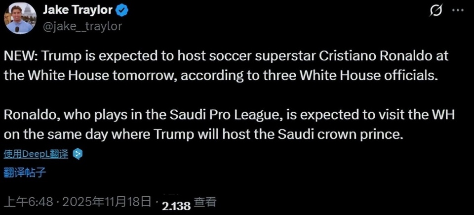 有趣的是就在这个发言之后不久,C罗居然要跟特朗普真正联动了!根据白宫记者杰克-泰勒给出的消息,特朗普将会在总统府邸正式跟葡萄牙巨星会面,当然,沙特方面也会安排高管陪同的。据悉,在跟C罗会面前后沙特王储也会跟美国方面有官方的会见。这也是此次路途主要目的。