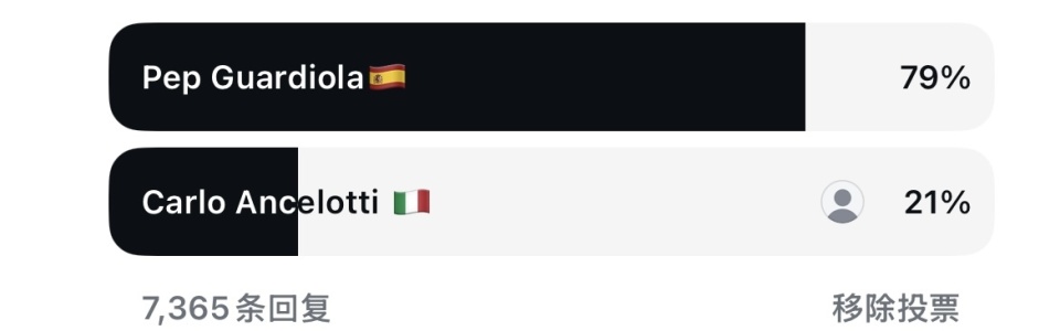 结果显示,瓜迪奥拉拿到79%的支持率,远远压过只有21%的安切洛蒂,短时间就刷出七千多条留言。