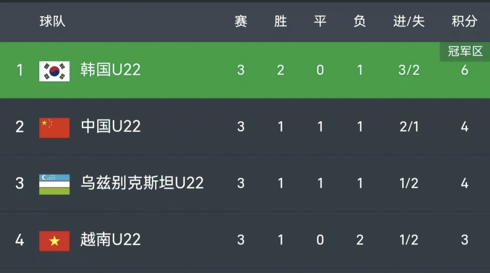 中国U22男足在本届赛事中经历跌宕起伏,首战他们0-1爆冷负于越南队,次轮2-0完胜韩国队找回状态,末轮0-0战平乌兹别克斯坦队。最终,中国U22男足以1胜1平1负积4分、净胜球+1的成绩收获亚军。唯一的失利来自0-1不敌排名垫底的越南,这场意外的失利成为U22国足无缘冠军的关键因素。