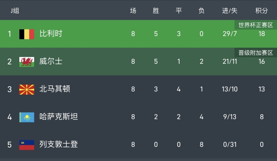 比利时18分锁定小组第一,直接出线。威尔士16分小组第二,晋级附加赛。北马其顿13分小组第三,但通过欧国联排名拿到附加赛资格。哈萨克斯坦8分,列支敦士登0分。