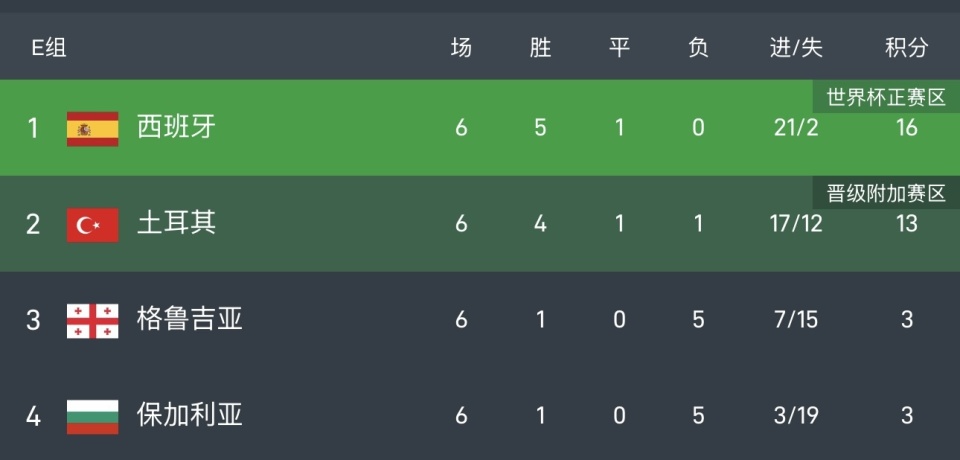西班牙16分小组第一,直通世界杯。土耳其13分小组第二,锁定附加赛。格鲁吉亚3分,保加利亚3分,双双出局。