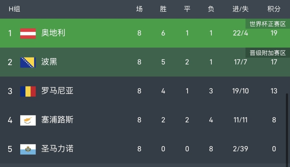 奥地利19分小组第一,直通世界杯。波黑17分小组第二,参加附加赛。罗马尼亚13分获得小组第三,但凭借欧国联排名晋级附加赛。塞浦路斯8分,圣马力诺0分,双双出局。