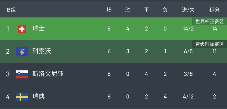 瑞士14分小组第一,直通世界杯。科索沃11分小组第二,晋级附加赛。斯洛文尼亚4分出局,瑞典2分垫底,但通过欧国联排名拿到附加赛席位。