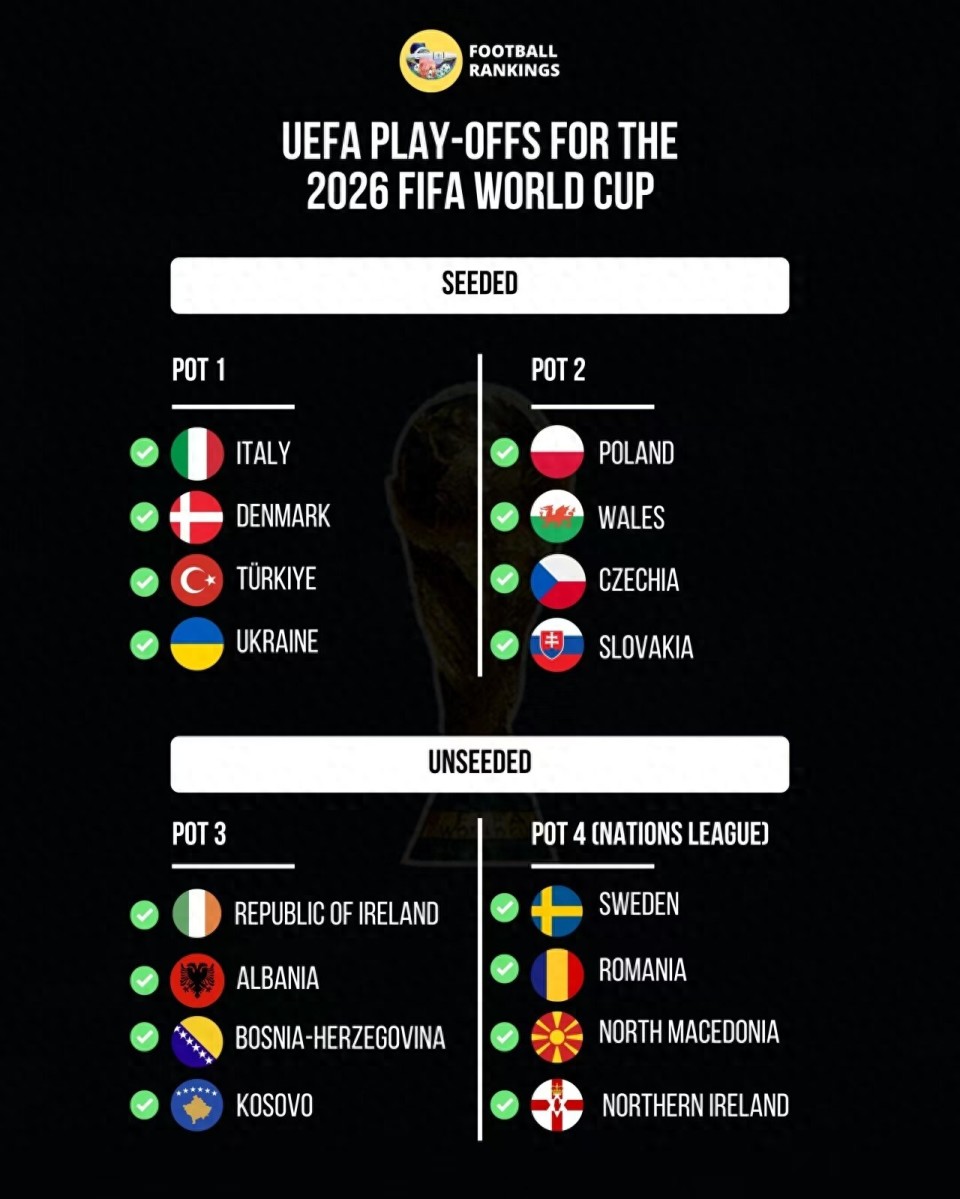按照赛制,第一档抽第四档,第二档抽第三档,第一档和第二档球队首轮比赛有主场优势,单场淘汰制,胜者抽签决定主客场再进行一轮淘汰赛,胜者晋级2026年美加墨世界杯。世预赛附加赛的比赛将于2026年3月26日和3月31日进行。
