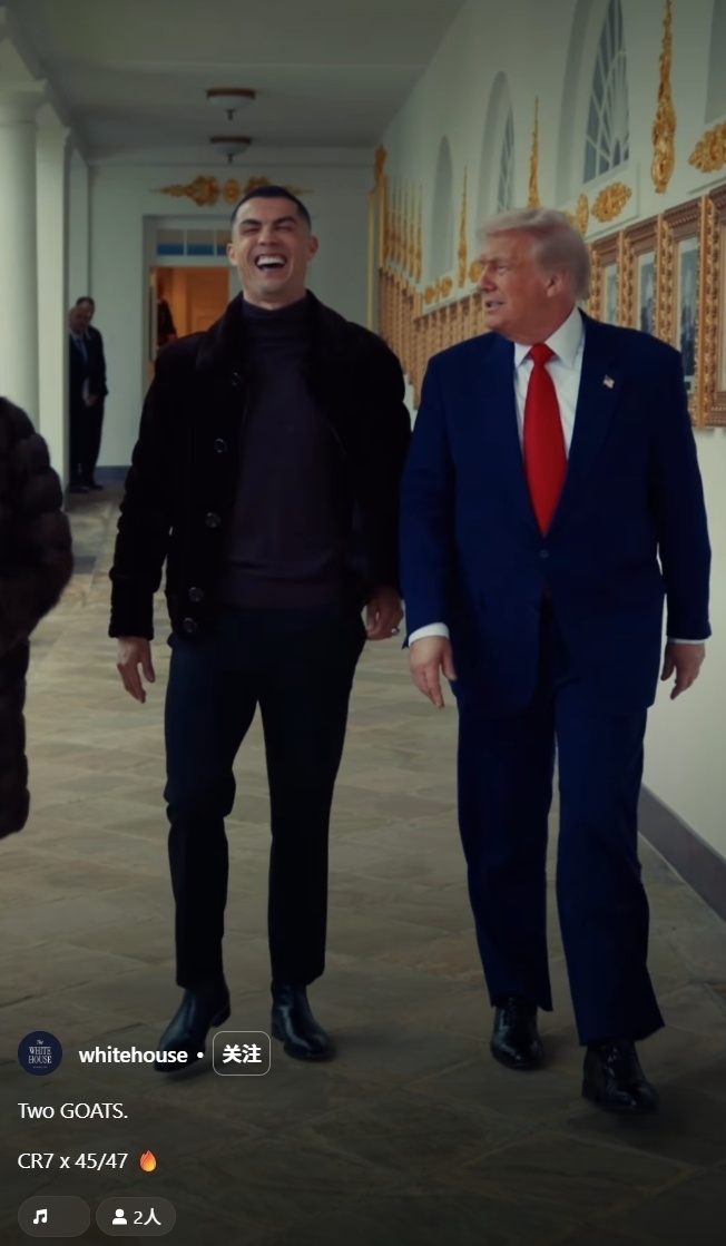 北京时间11月19日晚,白宫和C罗官方账号联合发布社媒,晒出了一段C罗与美国总统特朗普一同在走廊散步的片段,并且配文:“Two GOATS(两个历史上的最佳)”。