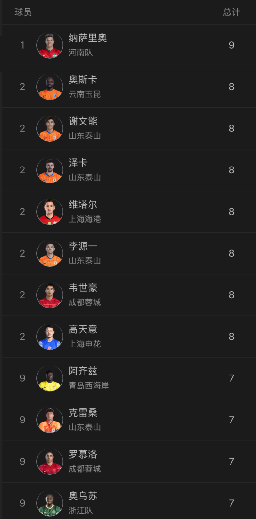 在奥斯卡离开后,中超助攻榜呈现群雄乱战。纳萨里奥9次助攻领跑。身后有7次8次助攻,4人7次助攻,因此末轮比赛谁能获得助攻王殊荣,悬念巨大。