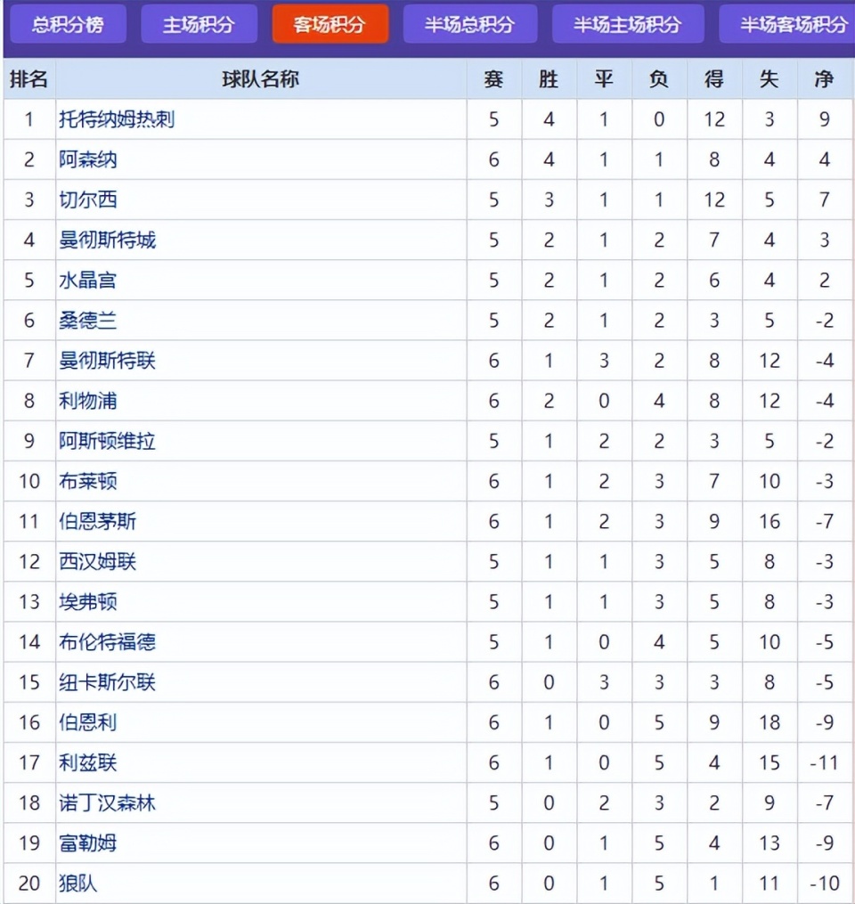 目前,热刺是英超唯一保持客场不败的球队(4胜1平),而且在客场进球以及客场失球方面都是第一。