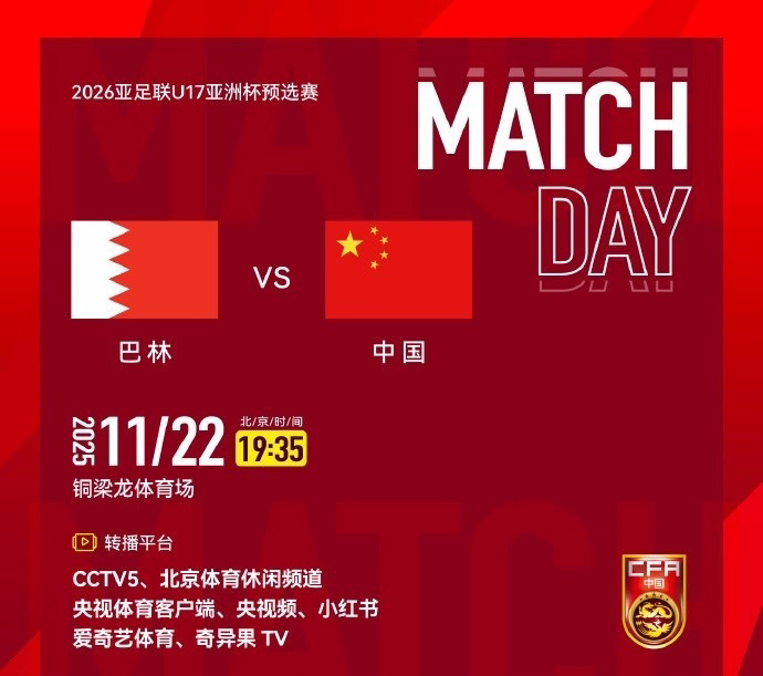 首轮即生死战!U17亚预赛-中国VS巴林首发:邝兆镭先发,谢晋替补
