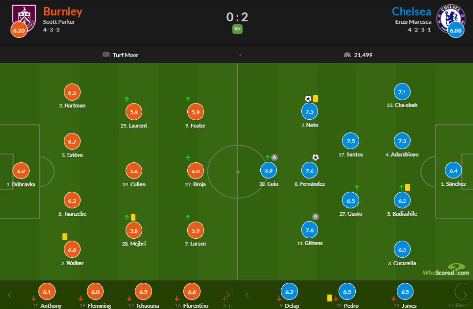 本场比赛切尔西虽然不在最佳的状态,但还是在客场创造出了不少有威胁的进攻机会,最终靠着内托和恩佐的进球,2-0击败了伯恩利,多赛一场的情况下,反超曼城升至英超积分榜第二。