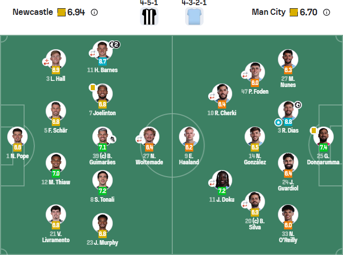 纽卡首发:1-波普、3-刘易斯·霍尔、12-佳夫、5-沙尔(77’4-博特曼)、21-利夫拉门托、8-托纳利、7-乔林顿、39-吉马良斯、11-巴恩斯(85’20-伊兰加)、23-雅各布·墨菲、27-沃尔特马德(85’28-威洛克)