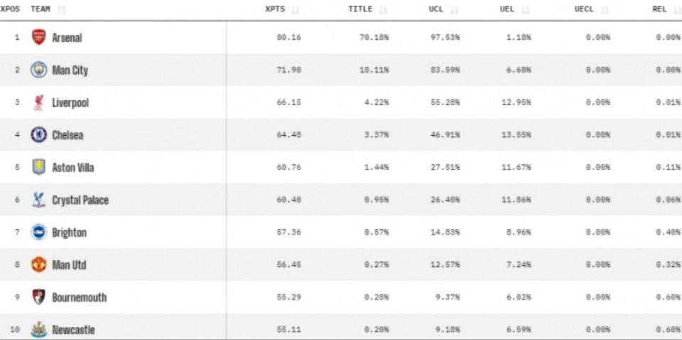 在前11轮联赛结束后,阿森纳排在榜首,但只领先曼城4分。考虑到阿森纳此前曾多次在领先后被曼城反超并丢冠,对枪手来说,4分的优势一点都不保险。与此同时,利物浦则是落后阿森纳8分。